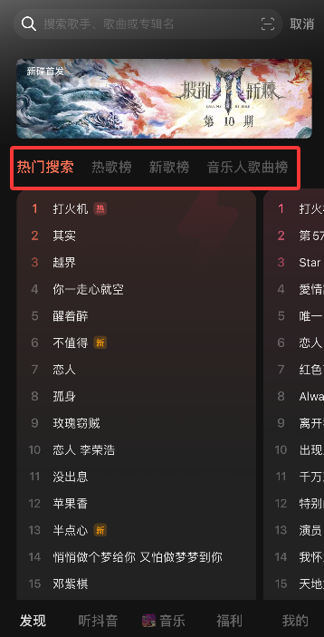 在首页上方的导航栏中,点击 搜索栏 图标,即可进入榜单界面。